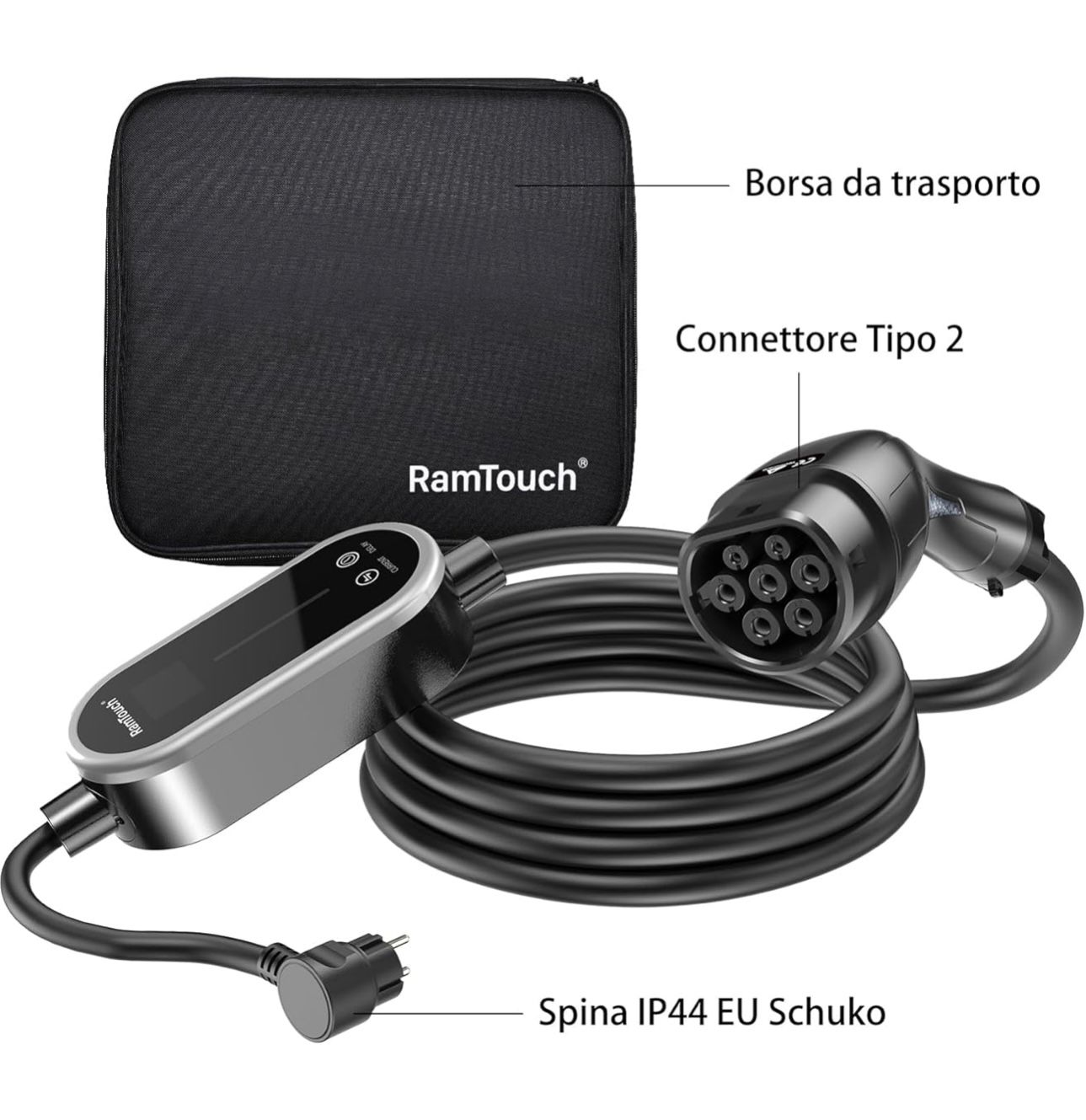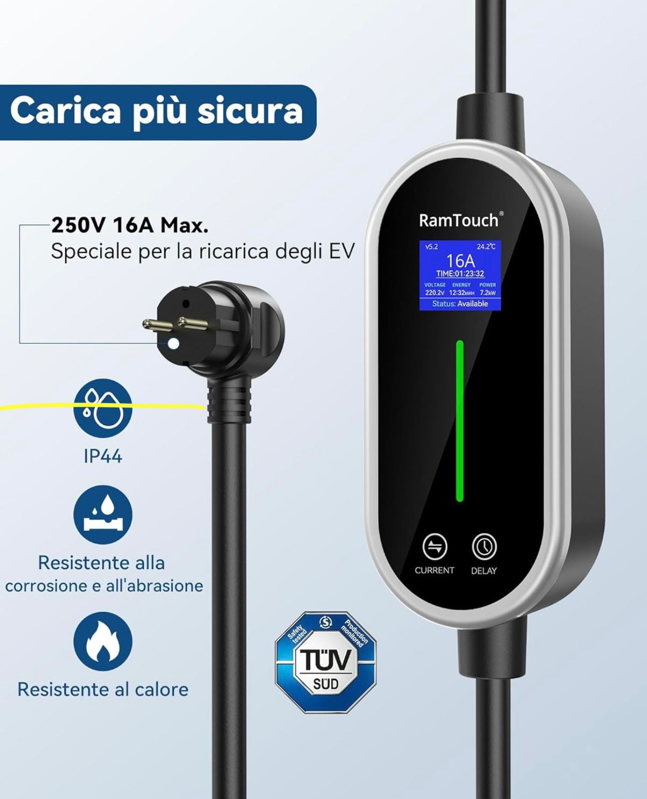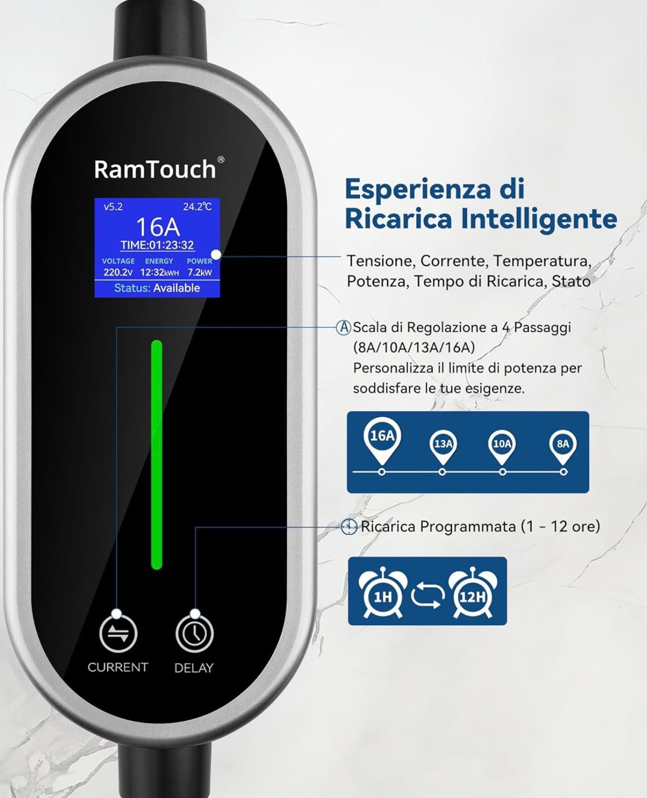 - Ricarica Intelligente e Sicurezza: Il cavo di tipo 2 integrato e la regolazione della potenza assicurano un'integrazione fluida con il sistema elettrico domestico. Memoria intelligente per le impostazioni preferite e ottimizzazione dei costi con ricarica programmata. Lo schermo LCD fornisce informazioni chiave. Sicurezza garantita—RCD di tipo A e protezioni moderne