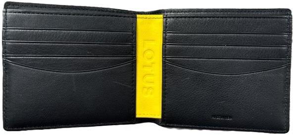 Carta realizzata in 100% pelle di vitello Nappa, con pannello a contrasto giallo e borchia in metallo con stemma rotondo LOTUS, fornita in confezione regalo.