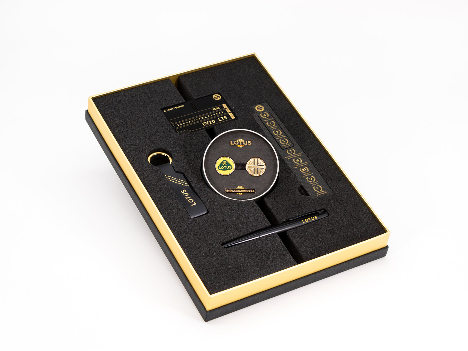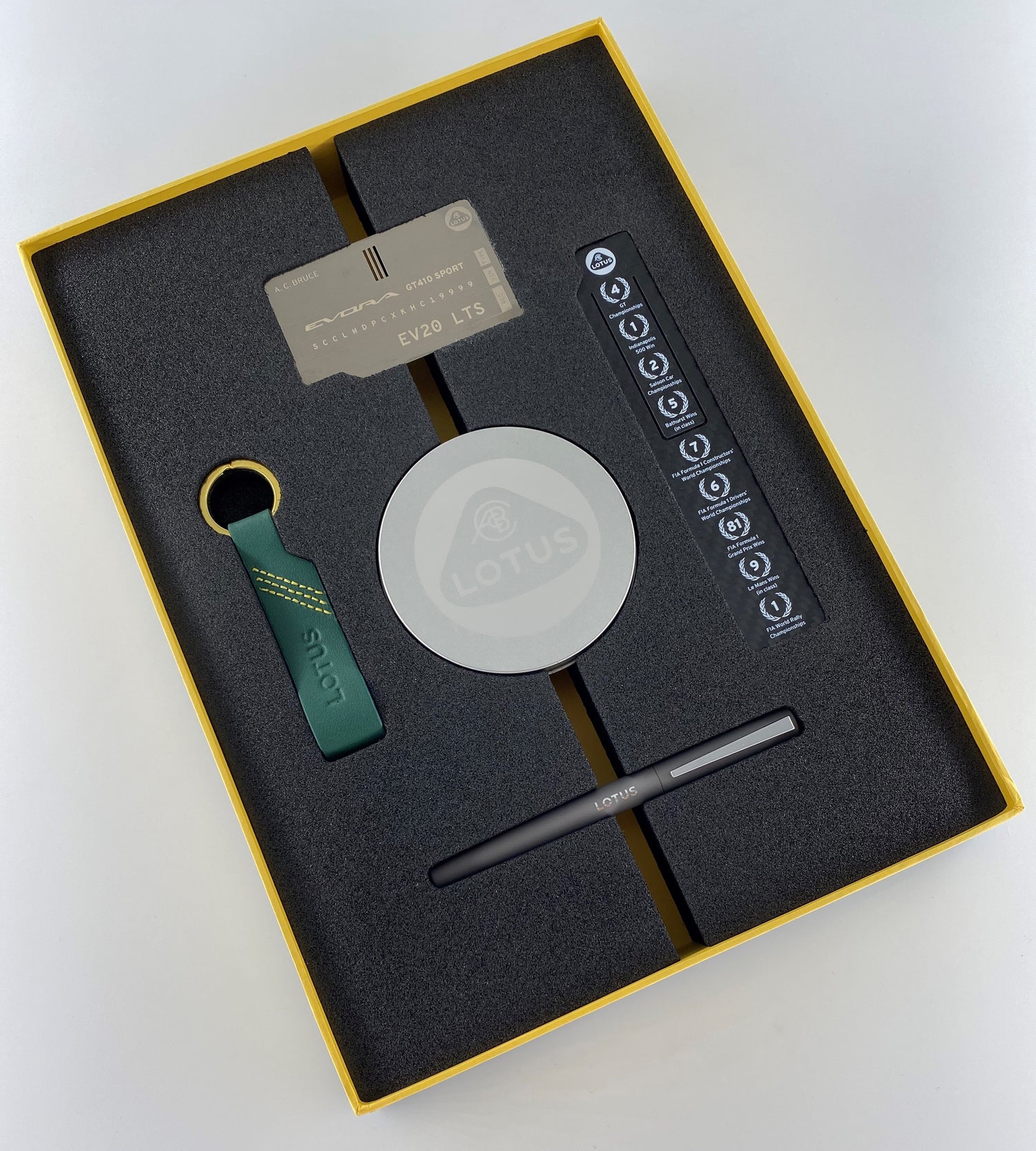 CONTENUTO DELLA CONFEZIONE: All'interno della scatola di presentazione c'è una selezione di oggetti da collezione Lotus, tra cui una targa in alluminio incisa con il nome del proprietario e le informazioni del certificato di provenienza; un portachiavi in pelle Lotus; un segnalibro in fibra di carbonio con le 9 vittorie più significativi del motorsport d; una scatola di presentazione di quattro distintivi; e una penna a inchiostro Lotus.