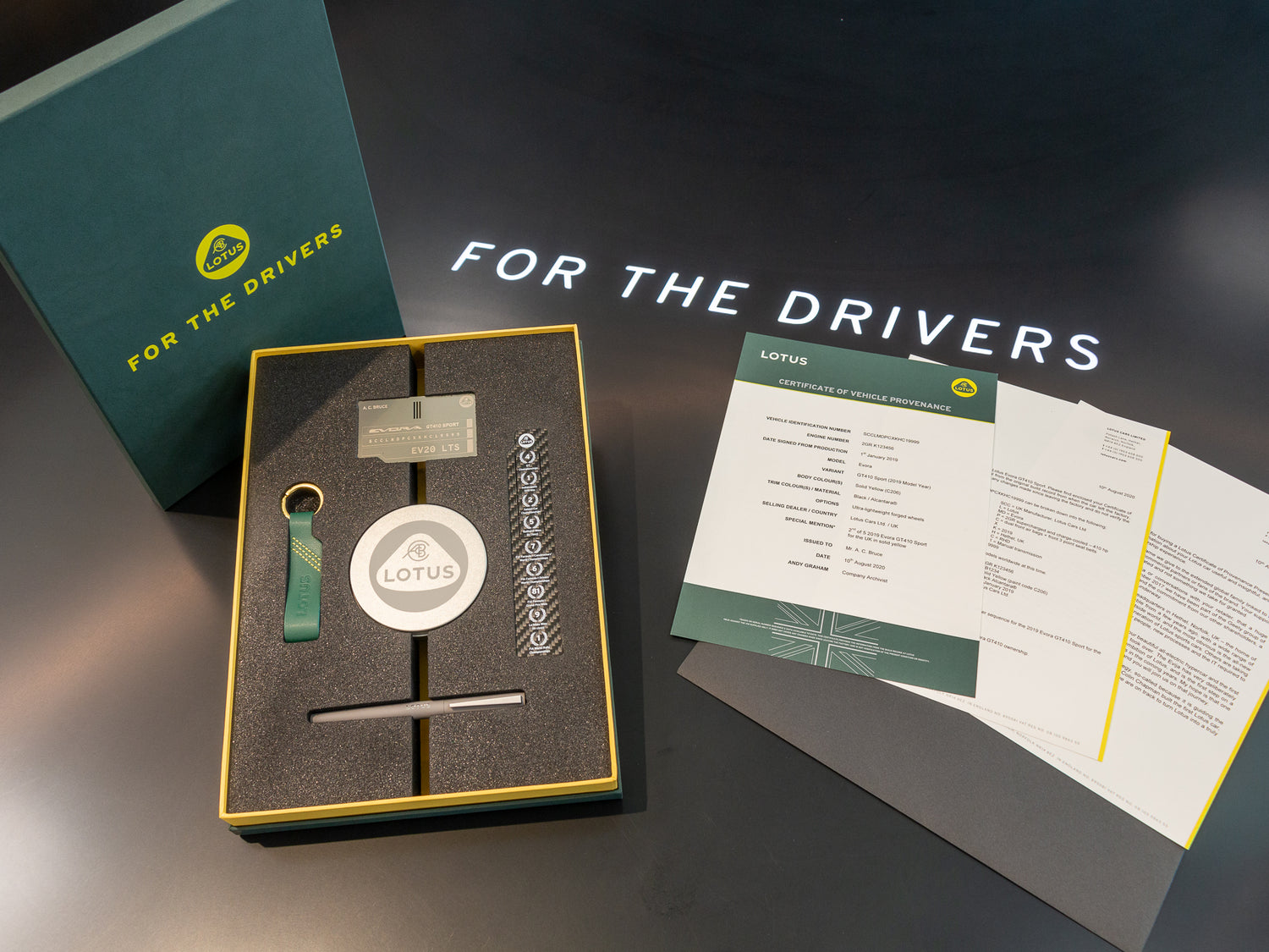 Il nuovo certificato di provenienza Lotus viene consegnato in una distintiva scatola di presentazione Lotus "For The Drivers".