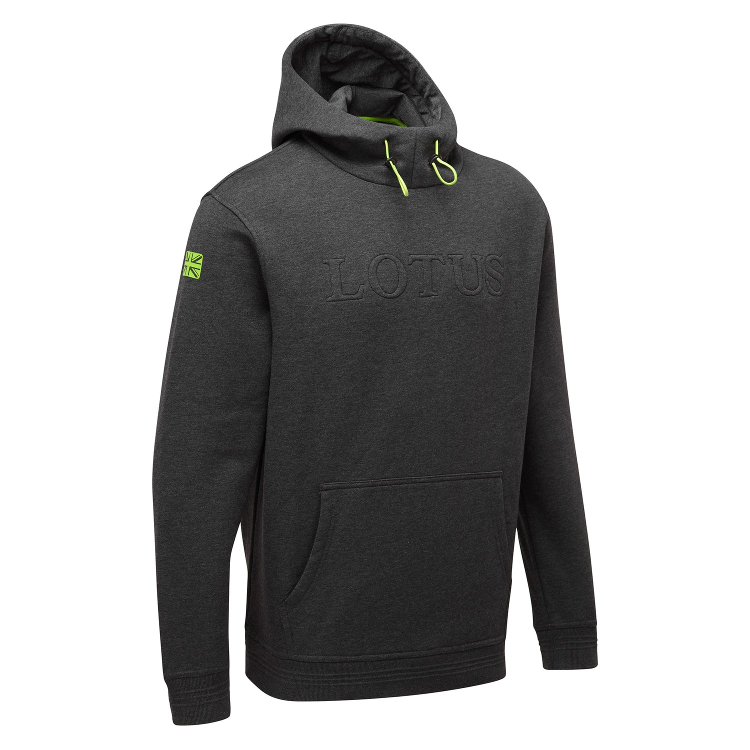 A very smart grey hoodie with the Lotus name embossed on front along with a kangaroo style hand pocket. Features a fully lined hood with lime green pull cords, jersey cotton cuffs and waist with a subtle grey stripe for a casual yet comfortable fit.