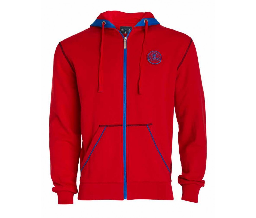 Smart but casual sweatshirt with hood and neck cord detail. Contrast stitching and details at seams, pockets and inside band of hood. Full zip front fastening with personalised Lotus zip. Embroidered Lotus roundel patch at chest and chain stitched ‘LOTUS’ letters on reverse. Pocket incorporated at front and gathered fabric at waist and sleeves for extra comfort and fitting. Material 100% cotton