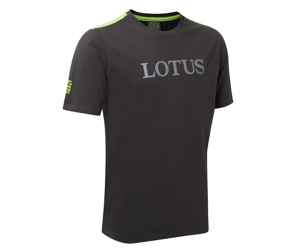 This grey crew neck t-shirt features the Lotus name in silver reflective print to the chest and the back neck-line Finished with a GB flag on the right sleeve and a lime green Lotus side tag on the waist.